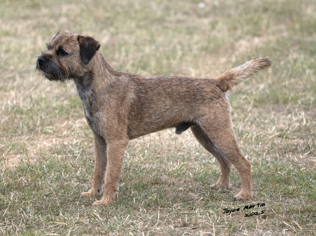 Another eye-catching and quality dog. Excellent otter head, correctly proportioned with a broad muzzle, plenty of strength under the eye which ensures a typical border expression. Nice for length of neck, shoulder and rib. He is well muscled with firm top line and strong and well angulated rear. Shown in harsh double coat harsh, with a thick, loose and pliable pelt, he is easily spanned. Moved confidently with reach and drive around the ring.
