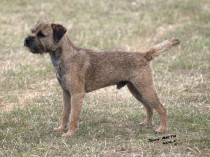 A very nice border bitch of excellent type and confirmation. She has a lovely otter head of correct proportions, strong and yet still feminine with large teeth set in a strong jaw. She has a good reach of neck which leads into smooth shoulder placement. Lovely straight front of correct bone, standing on neat cat-like feet. Ribs carried well back leading into a strong loin. Level topline on the move with tail straight off her back. Excellent harsh double coat and pliable pelt. Moved out well.