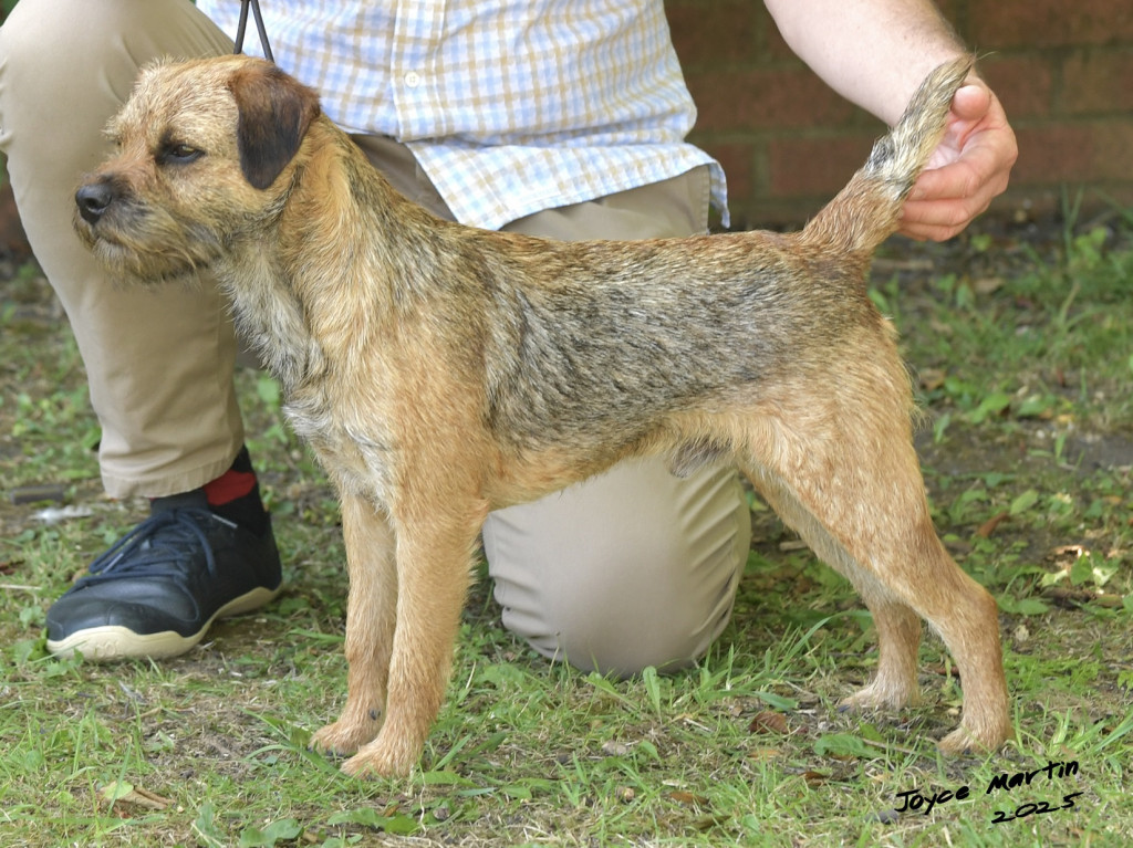 Dark grizzle and tan. Possesses a good masculine head, moderately broad skull, keen expression, well set on ears and good bite. Excellent neck and shoulders, and good return of upper arm. Lovely bone and feet. Excellent rib and easily spanned. Strong loin and good topline and tailset. Shown in a good topcoat, with a decent undercoat and pelt. This still very excitable youngster continues to give his handler a very tough time, doing all he could to present himself in the worst possible manner especially when moving around the ring. However despite this, on the odd occasion when he did co-operate, glimpses of his qualities could be appreciated.