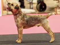 Nine month grizzle and tan bitch. Good for size and well balanced. Lovely feminine head and good muzzle. Teeth with scissor bite. She was narrow and easily spanned. Moved well coming, going and in profile. Correctly tapered short tail. Best Puppy. Puppy Terrier Group 4.