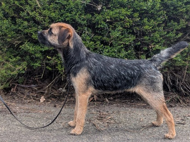 Blue and tan; otter head with kind keen eye. Scissor bite, with well laid back shoulders. Spanned. Narrow front with neat well padded feet. Thick pelt and good texture of a coat. Strong loin. Well angulated rear legs. Tail set well. Unlucky to meet No 1 today